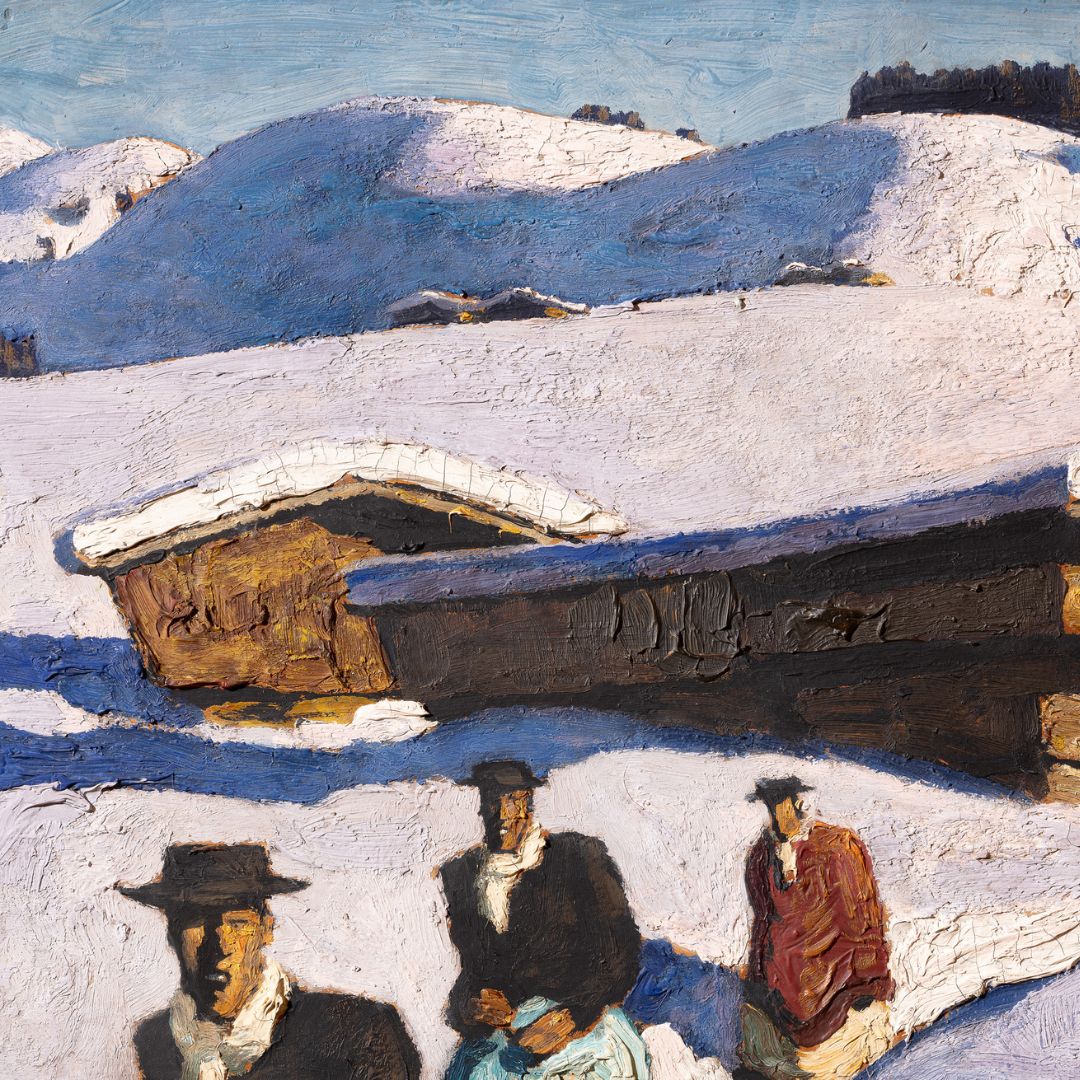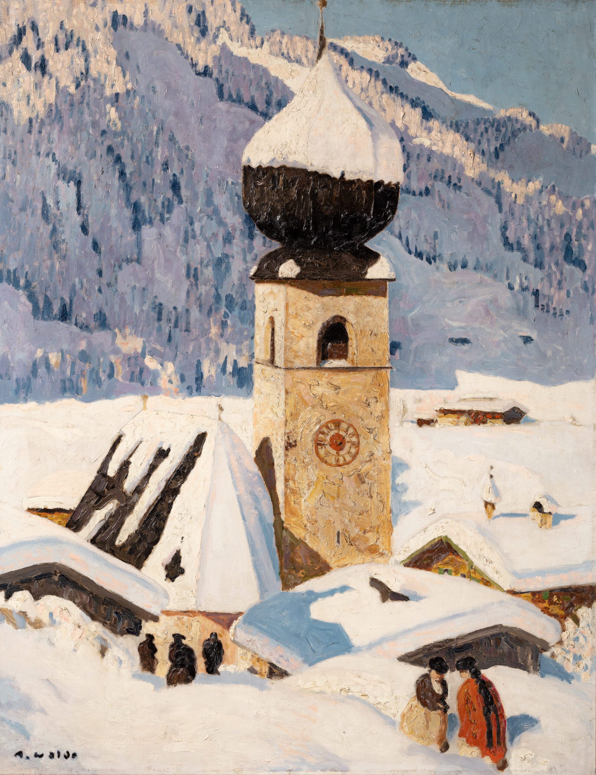 Das Motiv der Dorfkirche von Aurach nahe Kitzbühel mit dem spätgotischen Turm und der barocken Zwiebelhaube zählt zu den beliebtesten Sujets in Waldes OEuvre. Auf dem steilen Kirchendach sind Schneepartien in breiten Bahnen abgerutscht. Der Farbauftrag erscheint nur in wenigen Passagen pastos, meist wirkt er durch die feinen Nuancierungen fast temperaartig, in der Waldpartie im Hintergrund sogar impressionistisch. An den Konturlinien spart Walde den Farbauftrag aus und lässt den Bildträger Karton sichtbar werden; diese Malweise ist für ihn auch in späteren Werken charakteristisch.