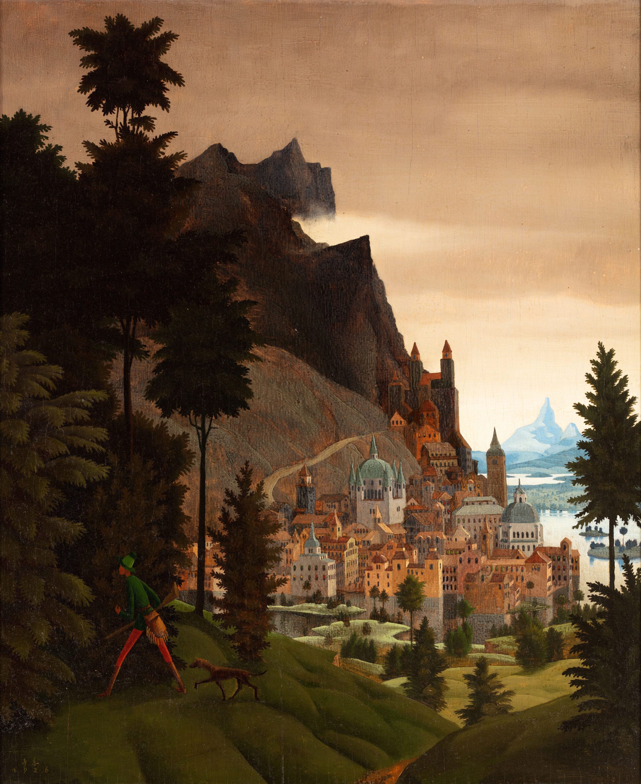 heißt das hier abgebildete Werk. Eine phantastische Stadtansicht am Fuße eines hohen, schroffen Berges, umgeben von einer Seenlandschaft mit sanften Hügeln im Bildvordergrund, die sich wie Kulissen staffeln und auch den Standort des Betrachters definieren. Der Bildausschnitt ist gesäumt von hohen Bäumen. Die dünnen, langstämmigen mit Laubkronen versehenen Bäume sind ein wiederkehrendes Motiv Franz Sedlaceks und ein Zitat altdeutscher Malerei. Vor den Augen des Betrachters verschwindet ein Jäger mit seinem Jagdhund im Dickicht des Waldes. Das Gemälde ist die erste Fassung dieses Themas und wurde 1929 in der Ausstellung „Neuromantik und Neue Sachlichkeit in Oberösterreich“ im OÖ Landesmuseum präsentiert. Hermann Ubell rezensiert dazu in der Linzer Tages-Post: „Schon die ersten Bilder, die er in der Wiener Secession ausstellte erregten Aufsehen und fanden willige Käufer. Von da an wuchs sein Ruhm von Jahr zu Jahr, und heute gehören seine Werke zu den meistbeachteten der deutschen Kunst der Gegenwart.“