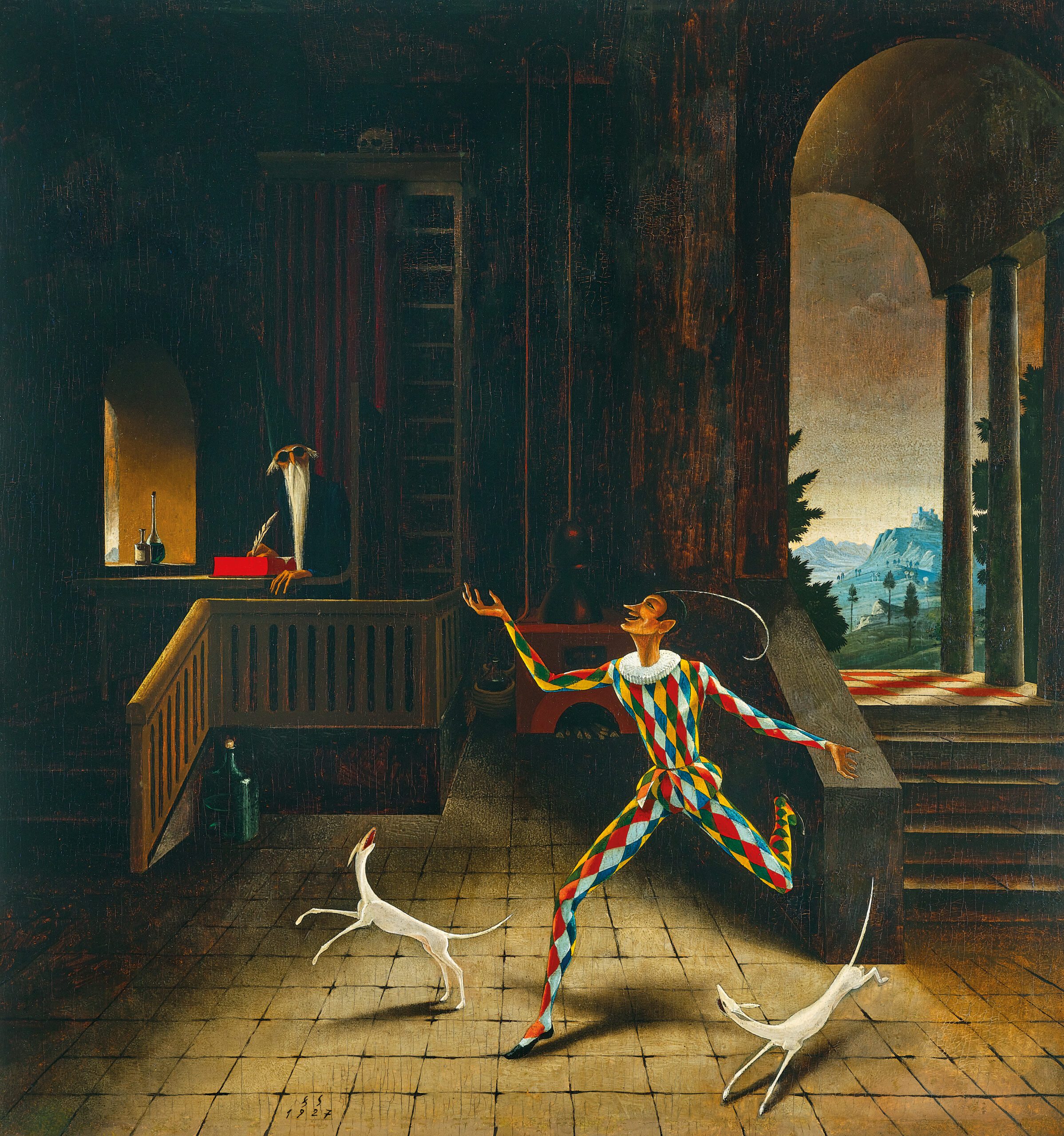 Das Gemälde Der Zauberer und der Harlekin stellt einmal mehr Franz Sedlaceks Talent für skurrile, phantastische Bildideen unter Beweis. Ein Zauberer mit langem, weißen Bart und Spitzhut sitzt auf einer Empore, und notiert etwas mit Federkiel in einem Buch. Ein Regal, gefüllt mit Reagenzien und ein Destillieranlage im Hintergrund ergänzen die Szenerie, die Sedlaceks Interesse für Alchemie betonen. Im Vordergrund springt ein Harlekin im typischen Rautenkostüm flankiert von zwei Hunden theatralisch in Szene. Die rechte Bildhälfte gibt den Blick frei auf eine typische Sedlacek-Landschaft.