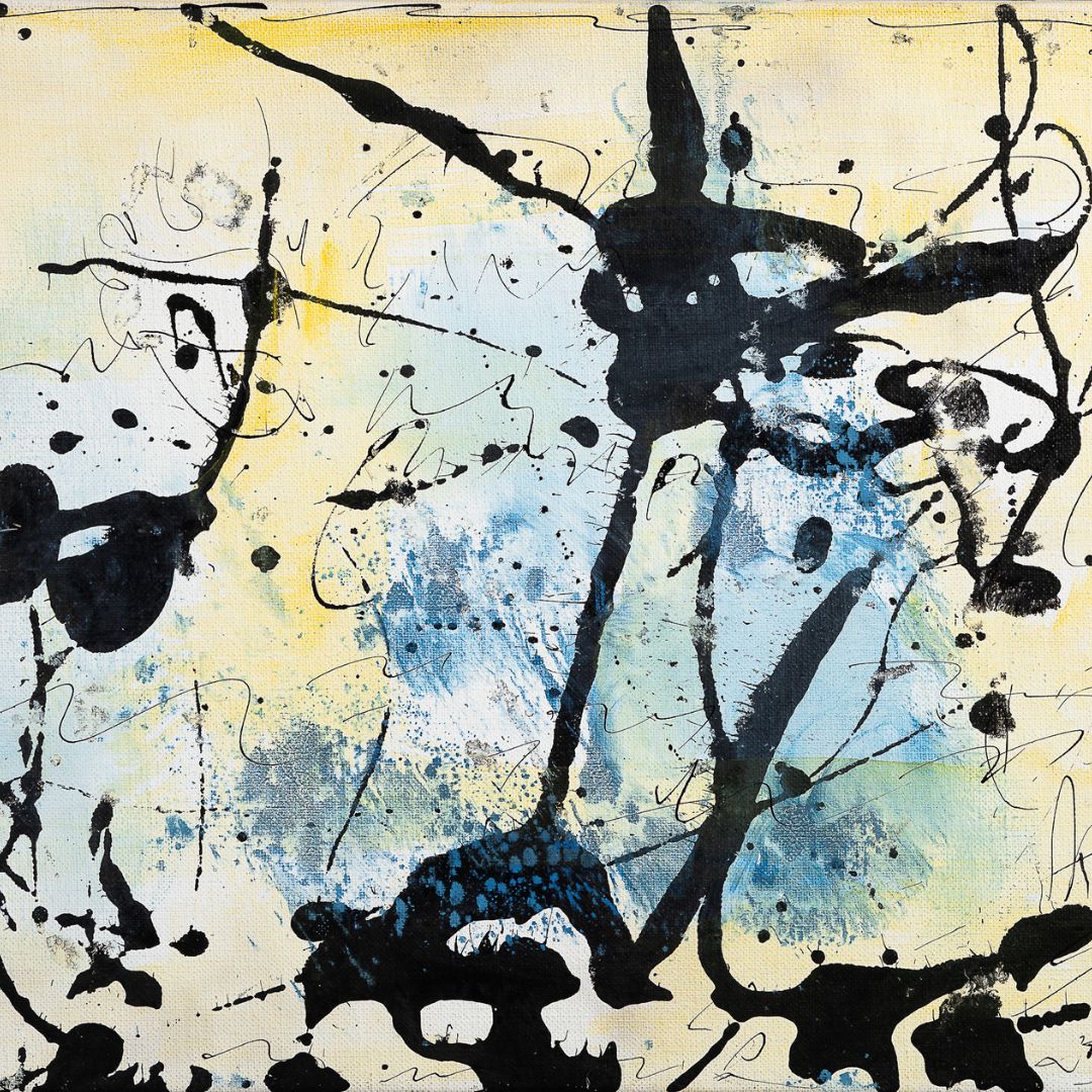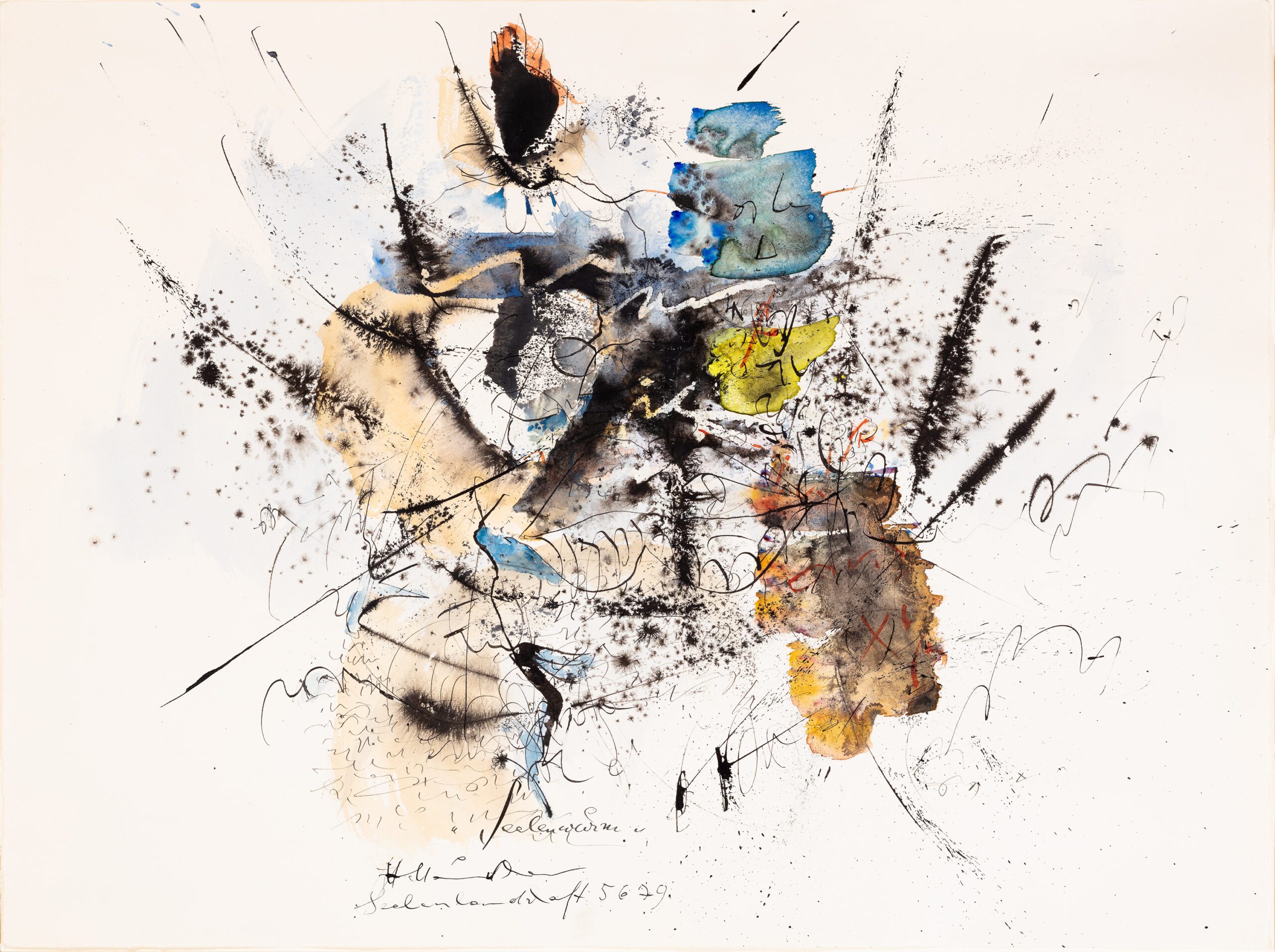 In dem Werk Seelenlandschaft setzt der Künstler die schwarze Tusche auf eine sehr elegante, fast poetische Art und Weise ein. Diese Schriftzeichen verschmelzen mit der harmonischen Farbkombination im Hintergrund zu einem harmonischen Ganzen.